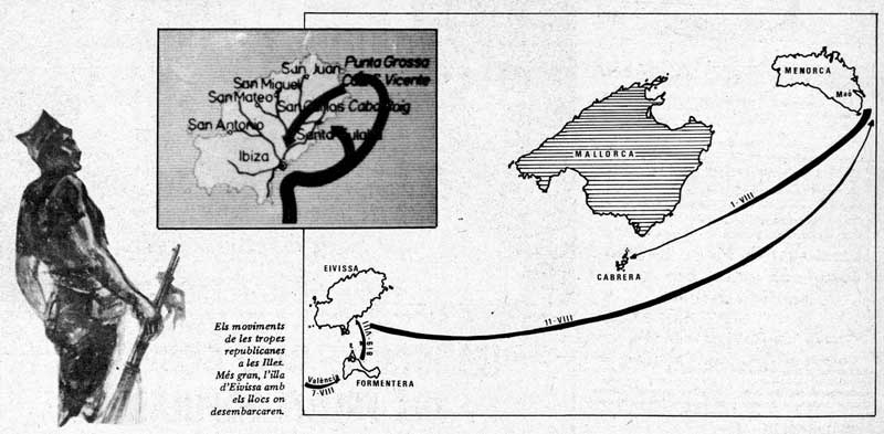 LES TROPES REPUBLICANES A LES PITIUSES El dia 7 d'agost del 1936 els destructors Almirante Antequera i Almirante Miranda, i els vaixells de transport Mar Cantábrico i Ciudad de Cádiz arribaren a Formentera. L'expedició havia partit de Barcelona i de València, i estava dirigida pels capitans Uribarri i Bayo. Formaven part de l'expedició, juntament amb els milicians catalans i valencians, i d'altres nacionalitats de l'Estat espanyol, eivissenc i formenterencs antifeixistes que havien pogut fugir d'Eivissa i de Formentera entorn al 18-19 de juliol, o bé alguns eivissencs que es trobaven per diversos motius a València o Barcelona, quan es produí el Cop d'Estat. Entre els republicans i els socialistes eivissencs que arribaren a les Pitiüses amb les expedicions de Bayo i Uribarri cal destacar a Just Tur, Agustí Gutiérrez, Guillem Tuells i Ramón Medina. Els quatre actuaren d'intermediaris i parlamentaren, o ho intentaren, amb les forces franquistes per tal d'evitar tot tipus d'enfrontament armat. Tornant a l'arribada a Formentera del dia 7 d'agost es pot afirmar, després de consultar diverses fonts, que la rendició es produí de manera inmediata, i sense gaire resistència. De fet Just Tur i Agustí Gutierrez, destacats de l'esquerra eivissenca, que havien demanat ajuda a Uribarri a València, davallaren dels vaixells, i amb una lanxa arribaren a Formentera, on parlamentaren fonamentalment amb el tinent Miquel Tuells i aconseguiren la rendició inmediata de l'illa. Les forces militars que hi havia a Formentera, franquistes, eren una secció del regiment de Palma, i un grup de carrabiners i guardies civils. Cal recordar que un dels eivissencs que va arribar des de València, era Guillem Tuells, germà del tinent M. Tuells que es va rendir. La resistència a Formentera fou, segons les diverses fonts, mínimes, a excepció del sargent d'Infanteria Cardona, i del capellà del Pilar. A la relació de morts de Formentera, que dóna el Diario de Ibiza el 13 de setembre de 1937, fruit de tota la problemàtica de la ocupació republicana hi figuren Joan Torres i Torres, capellà del Pilar; Lucas Ramón Cardona, sargent d'Infanteria; i Bartomeu Torres Planells, carter. Les noves autoritats republicanes començaren molt ràpidament a restablir l'entramat institucional de la República a Formentera. El tinent Miquel Tuells va enviar, segons el testimoni del capità Bayo, un telegrama al Comandant Miltiar d'Eivissa Juli Mestre Martí, solicitant la seva rendició. Aquest telegrama va esser enviat per ordre de Bayo i no va esser contestat. Un segon telegrama de solicitud de rendició de les forces militars d'Eivissa va esser enviat directament per Bayo. Aquesta vegada, sí que va esser contestat pel Comandant Militar. El text del telegrama de Bayo deia: Si se entrega, sus vidas serán respetadas. Si quiere usted que hay sangre, la habrá en abundancia. La resposta del Comandant Militar fou: Habrá la sangre que quiera usted que se derrame. El testimoni d'aquest dos telegrames el dóna Josep Massot i Muntaner. Les tropes republicanes intentaren des de Formentera fer arribar una lanxa a Eivissa per parlamentar i aconseguir la rendició. A aquesta lanxa hi anaren entre d'altres, Guillem Tuells i Ramón Medina, membres de formacions republicanes eivissenques. No pogueren desembarcar, atès que les forces miltiars franquistas començaren a disparar. Dies abans s'havien llançat octavetes des d'avions incitant a la revolta contra els militars franquistes. El testimoni del Tinent Coronel Andrés Real, l'any 1943, és el següent: ... intimitación.- El día 31 de Julio, por medio de un avión rojo se intima a la rendición bajo amenaza de ser arrasada la población por la aviación y buques de guerra. Contesta el Comandante Militar ordenando se haga fuego contra el avión y publicando una proclama llena de ardor patriótico rechazando la respuesta.- El Ataque rojo.- el 7 de Agosto una expedición roja compuesta por más de tres mil hombres protegidos por los destructores "Almirante Miranda" y "Almirante Antequera" y seis hidroaviones, asaltan la isla de Formentera. Vuelan los aviones sobre esta ciudad, y por medio de proclamas conceden dos horas para la rendición. Se les contesta con fuego de ametralladora y descargas de fusilería. Las escasas fuerzas son distribuidas entre los puntos de más fácil desembarco. Se desplaza de unos buques de guerra una canoa, conduciendo, seguramente, parlamentarios. No se les recibe y se les obliga a regresar al buque. Comienza seguidamente el bombardeo de la Ciudad por los aviones y buques de guerra, que se sitúan a menos de un quilómetro cañoneando impunemente la Ciudad. El 8 se produce el desembarco rojo, con más de tres mil hombres, protegidos por los aviones y buques de guerra por el sitio conocido por "Pou des Llao" (a unos 23 kms. de la Ciudad), a donde es desplazada la mayor parte de la escasa fuerza con que se cuenta, entablándose combate. El día 9 la Ciudad es sometida de nuevo a bombardeo siendo ocupada por los rojos a pesar de la actuación heróica, abnegada y de acendrado espíritu patriótico de los defensores". Sembla, però, que la resistència no va esser tan grossa com la font militar esmentada indica, i es pot afirmar que després de l'acció directa de vaixells o avions amb un interval per a l'evacuació dels estrangers, i després de diversos desembarcaments els dies 8 i 9 d'agost, es va ocupar Eivissa sense trobar gaire resistència. La guarnició es va rendir i els empresonats dels feixistes i gent que estaba amagada com Rafael Albertí i Maria Teresa León, varen quedar allibertats del feixisme. El testimoni de Guillem Tuells al respecte publicat a Uc el 10 de setembre de 1977 és: Cuando llegamos los republicanos ¡, todo el mundo, al menos en apariencia, nos recibió muy bien. Recuerdo que en las páginas de "Diario de Ibiza" aparte de dársenos la bienvenida se organizaron suscripciones públicas a favor de las tropas republicanas, 